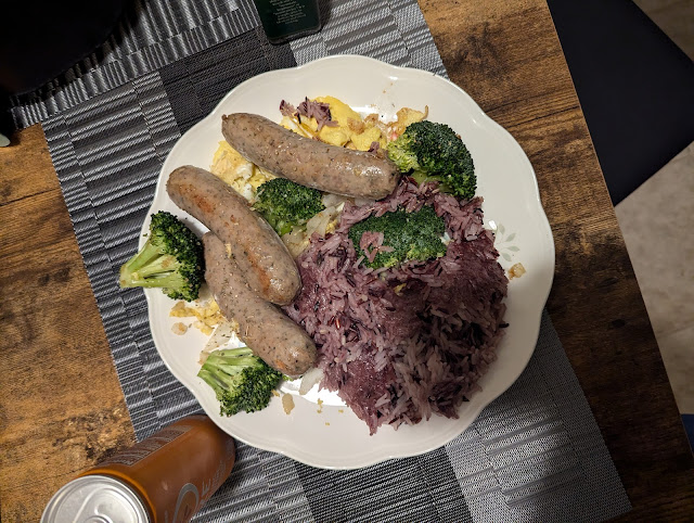 Here I used some sausage from costco and they kinda suck I think this was the last time I ate them but I also threw in some egg and brocolli you can see brocolli is a reliable role player you just throw them in and its good.